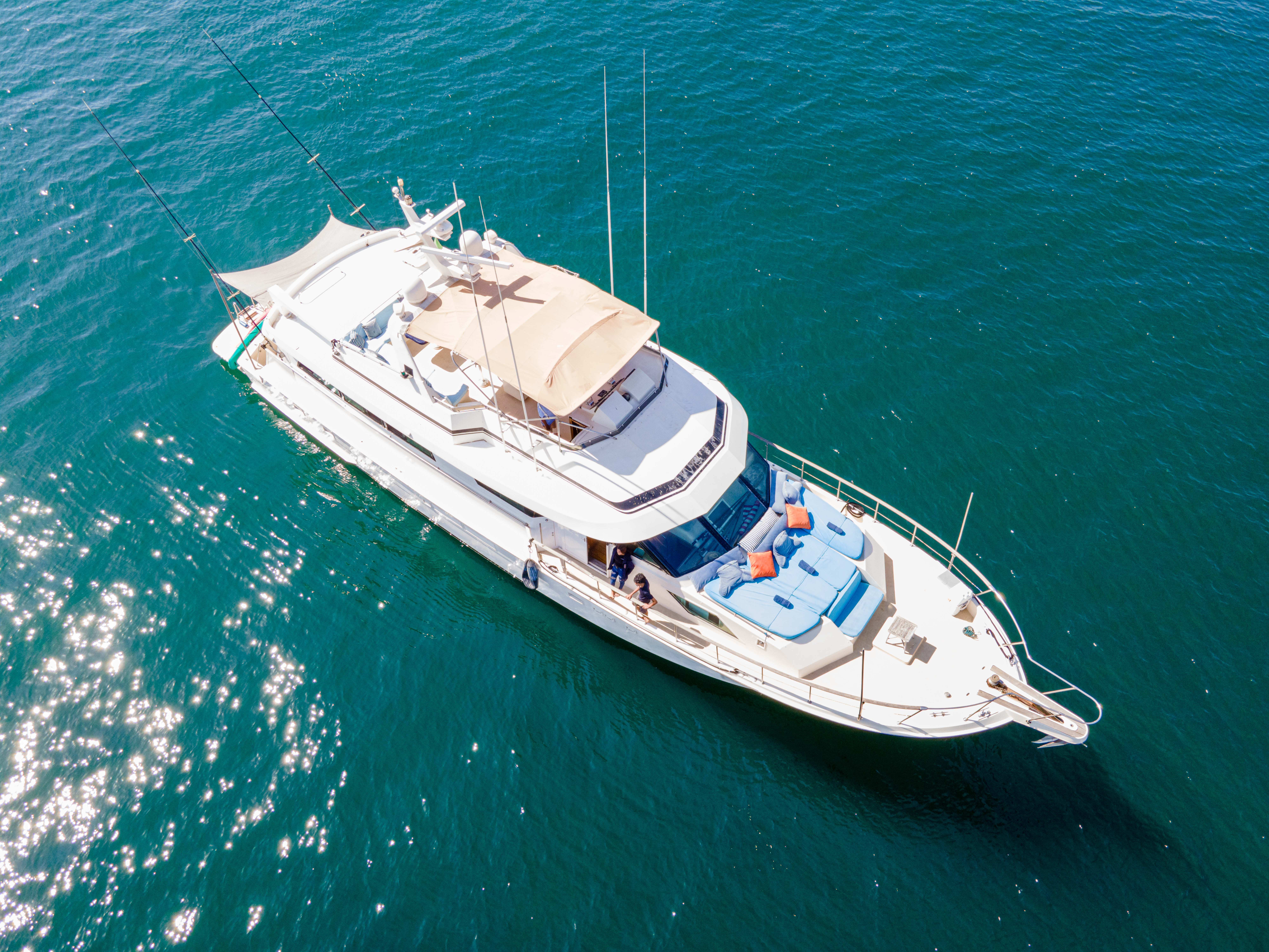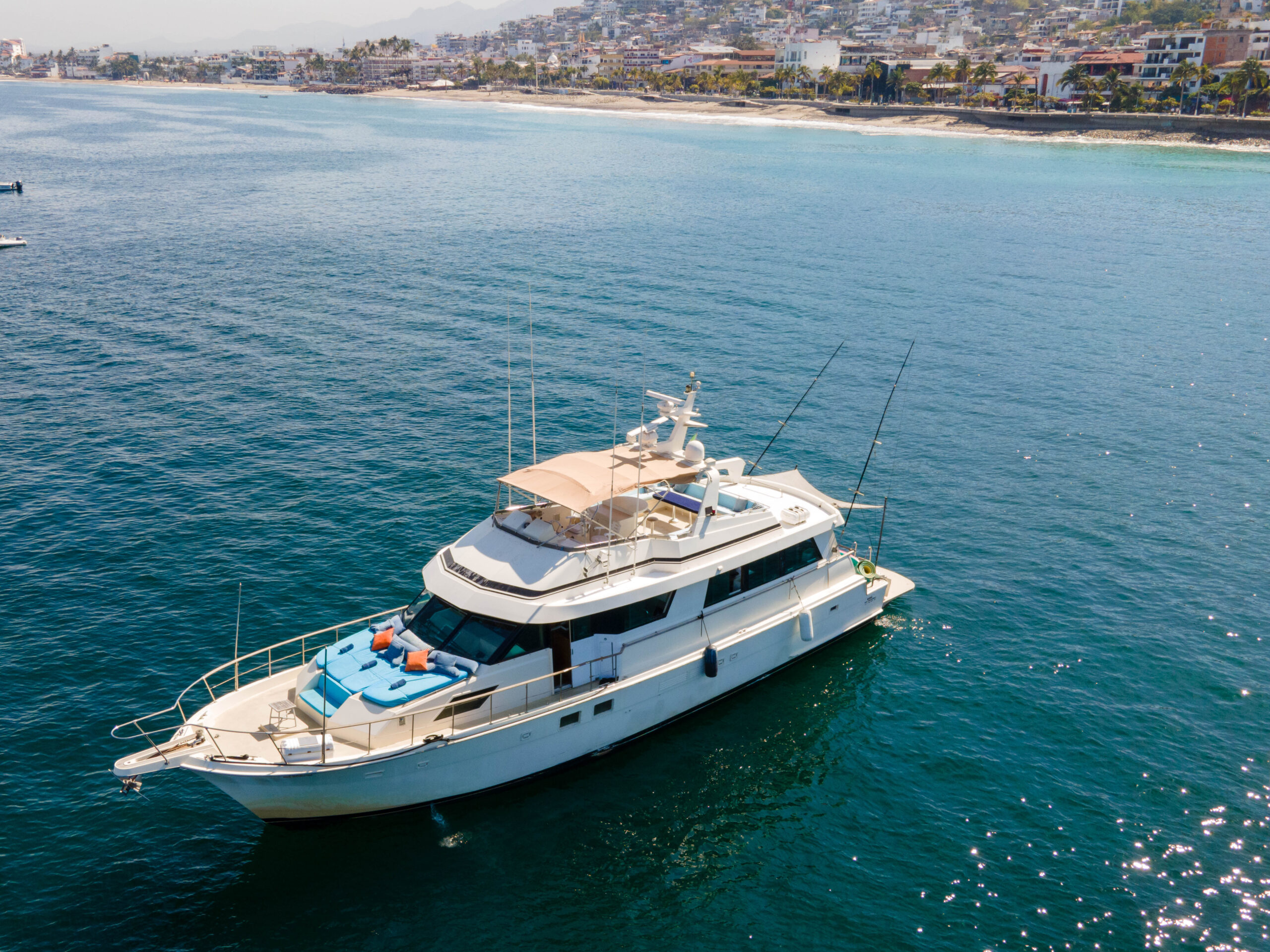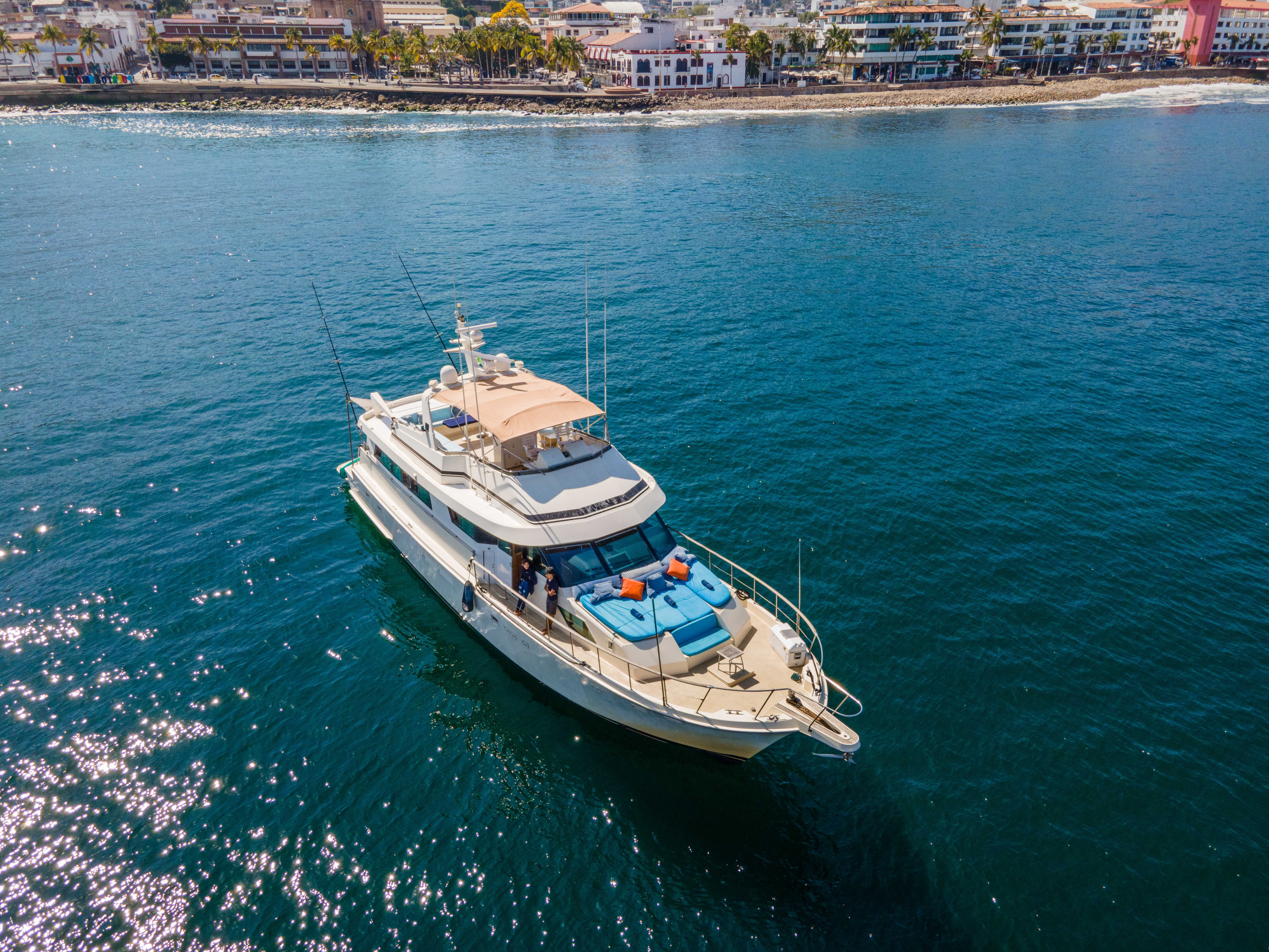 Vallarta Yacht Charter provides private day charters for up to 20 guests and overnight charters for up to 8. The Aurora Yacht, a luxurious 75-foot Hatteras, features a spacious flybridge with seating for 30+ people, a wet bar, and comfortable couches, is equipped with state-of-the-art electronics.