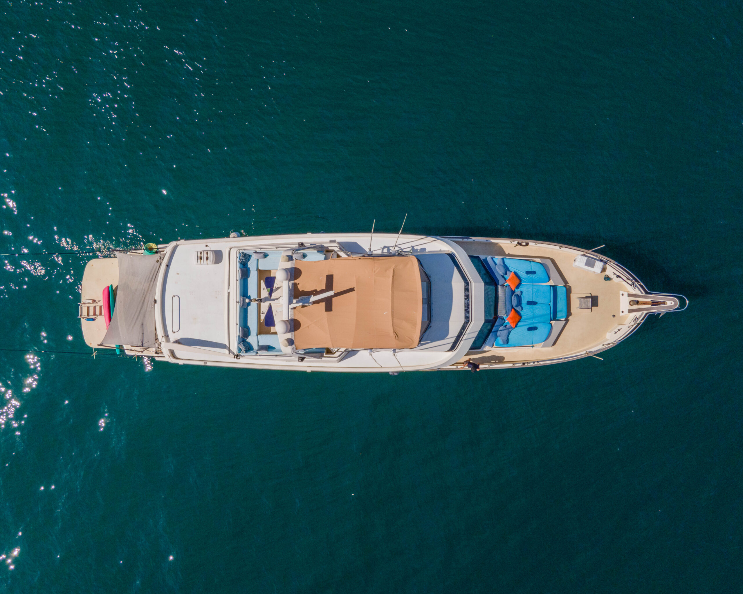 The yacht includes 4 staterooms with TVs, sleeping 8 guests, 4 full bathrooms, and an air-conditioned living salon, dining area, and kitchen. Enjoy a premium surround sound system with iPad docks for personalized music or choose from our extensive playlist.